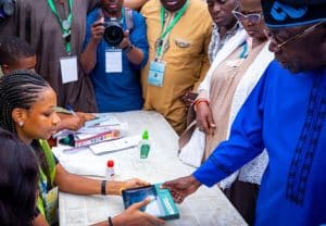 Senator Bola Tinubu, the Presidential Candidate of the All Progressives Congress (APC), on Saturday, cast his vote at his Ward 3, Alausa, Lagos about 10: 15 a.m. in the presidential election.