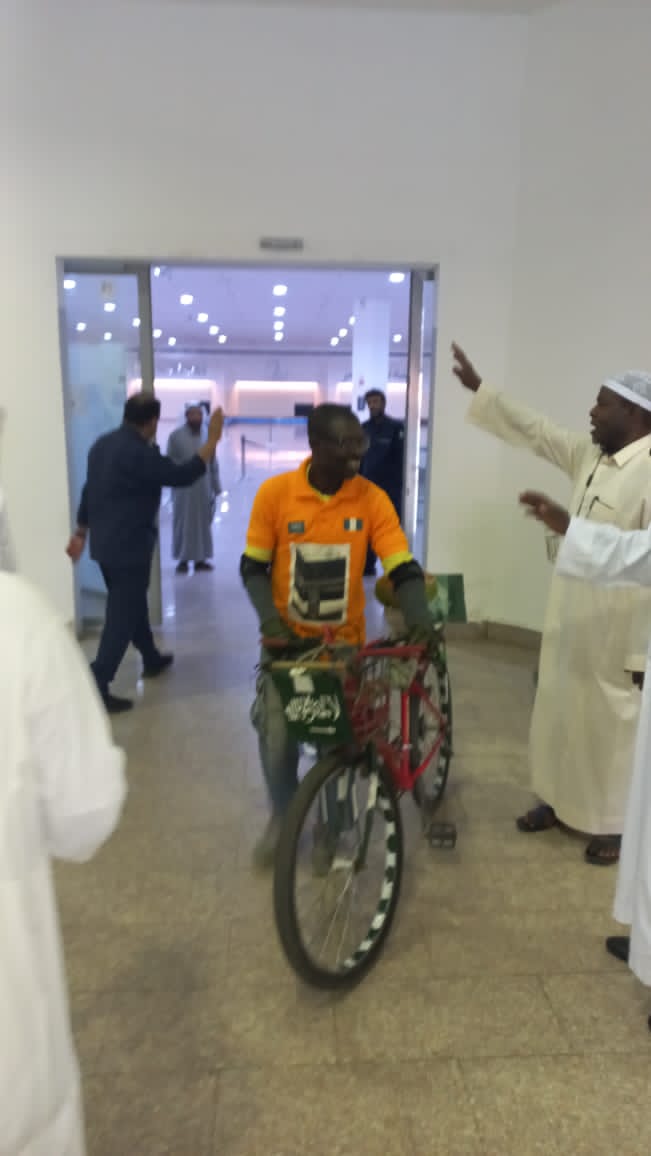 Nigerian Ambassador to Saudi Arabia, Yahaya Lawal, has welcomed Aliyu Bala, the Nigerian who rode a bicycle from Jos in Plateau State to the Kingdom of Saudi Arabia.