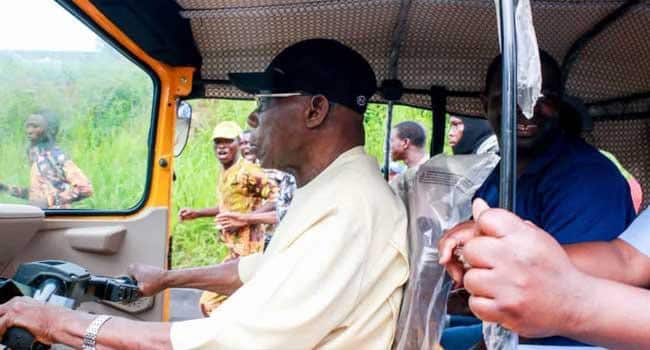 Former President Olusegun Obasanjo, on Saturday, engaged in commercial tricycle business as he rode and picked a male passenger around Kuto area of Abeokuta.
