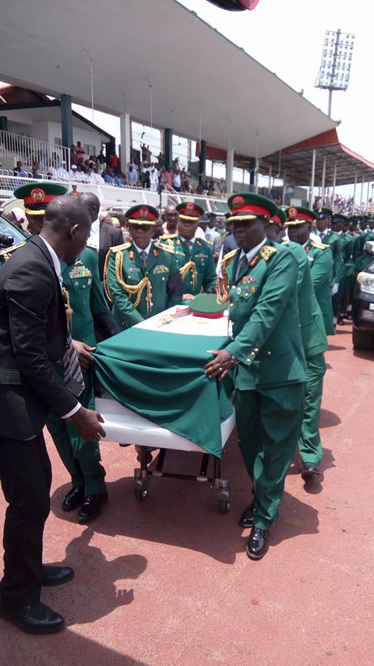 The body was interred by family members at 1.47 p.m. with a 21-gun salute by men and officers of the 4 Brigade in Benin.