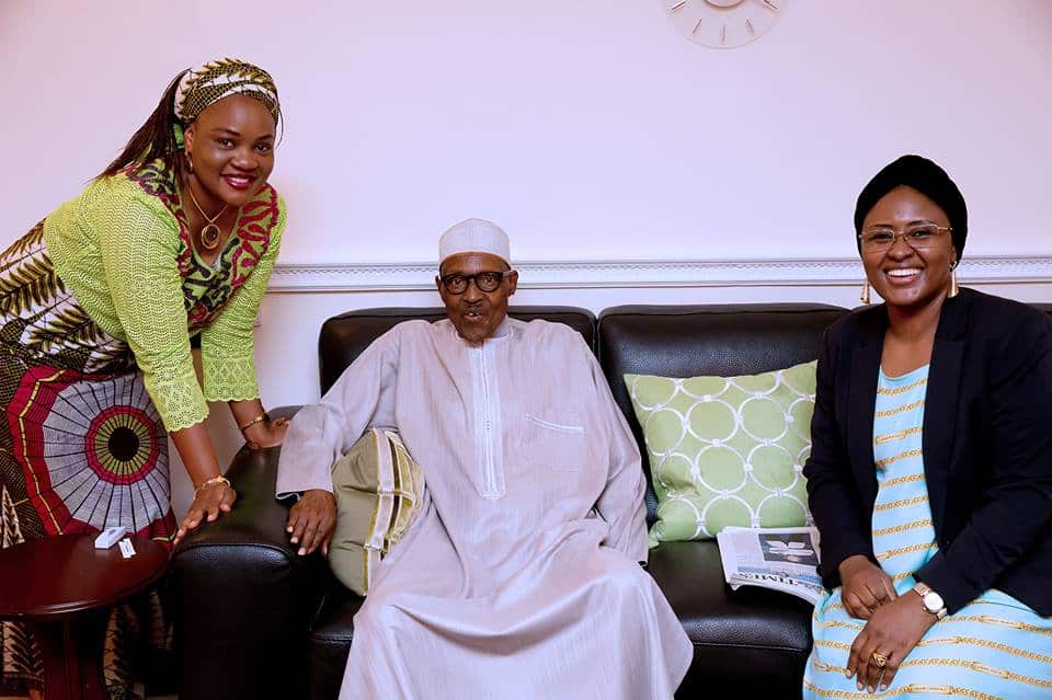 Eunice, wife of Governor Samuel Ortom of Benue State (left), with President Muhammadu Buhari and his wife, Aisha, in Abuja House, London…on Wednesday.
