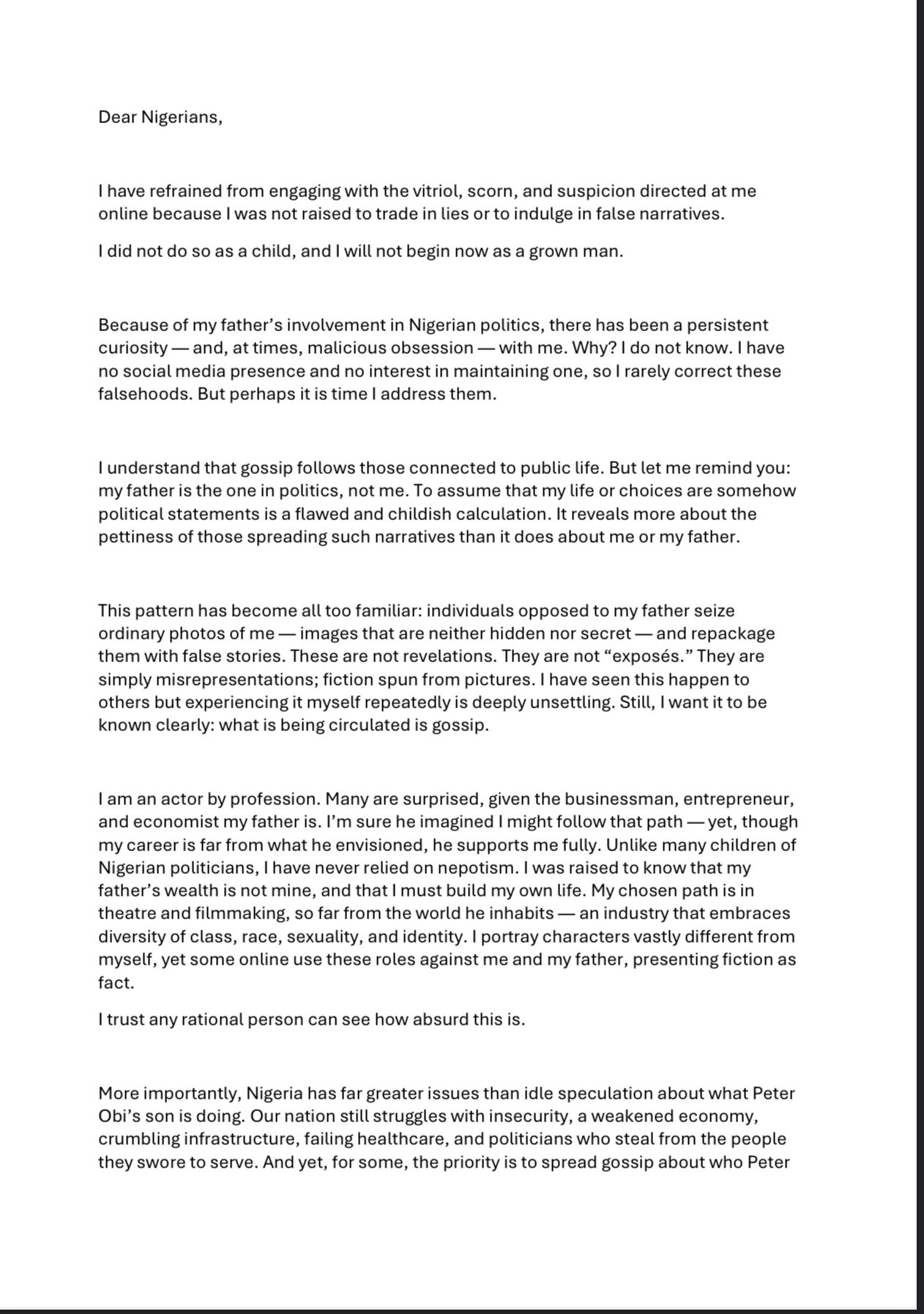 “Because of my father’s involvement in Nigerian politics, there has been a persistent curiosity — and, at times, malicious obsession — with me,” he wrote. “I have no social media presence and no interest in maintaining one, so I rarely correct these falsehoods. But perhaps it is time I address them.”
