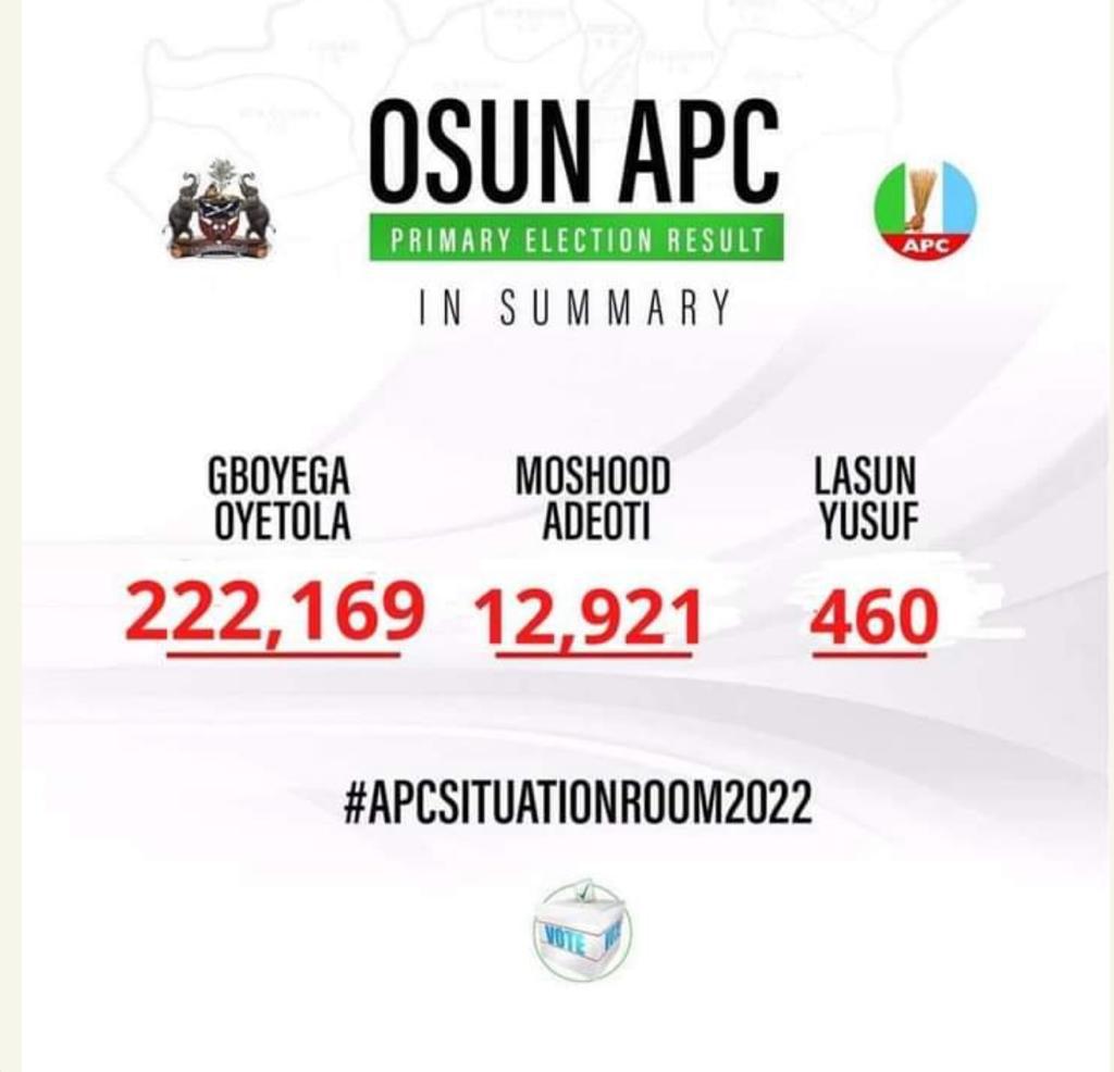 Governor Gboyega Oyetola of Osun State has been declared the winner of the All Progressives Congress (APC) governorship primary election in the state.