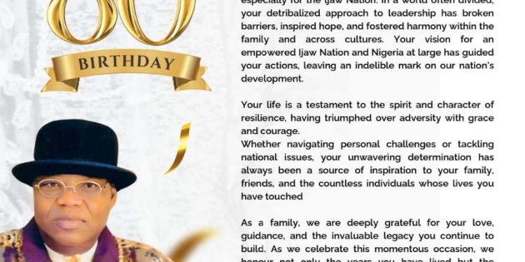 In celebrating their son, Chief Bukazi L. Etete of the Etete Royal Family of Odi described the former minister as a “shining example of what it means to serve, be loyal and industrious with an unwavering commitment to unity and progress especially for the Ijaw nation. In a world often divided, your detribalized approach to leadership has broken barriers, inspired hope and forged harmony within the family and across cultures.”