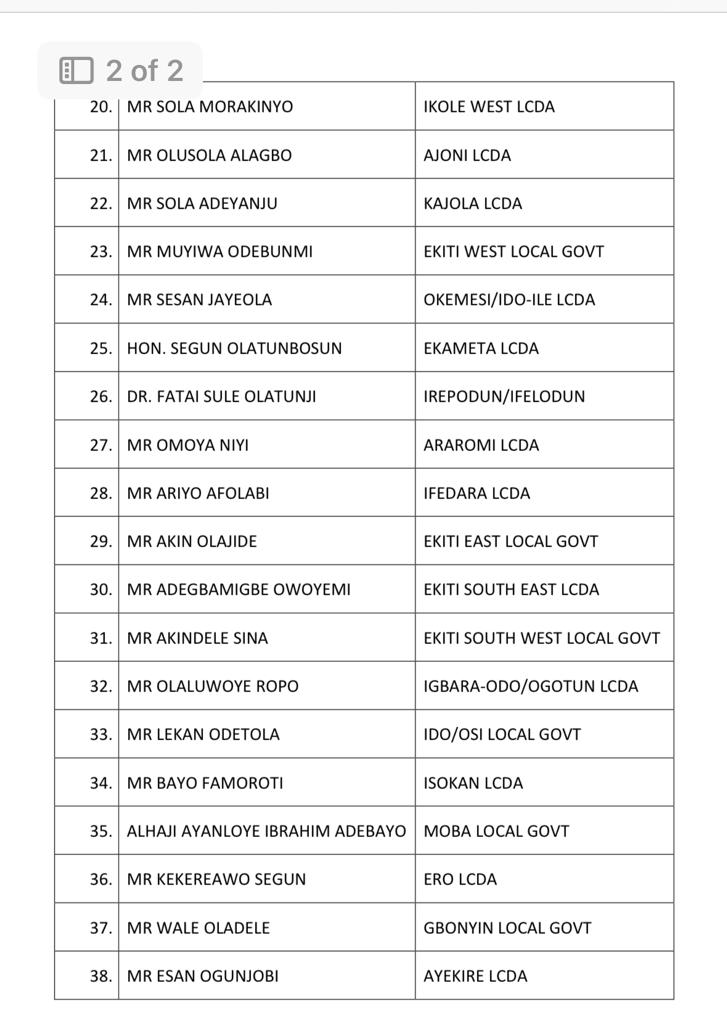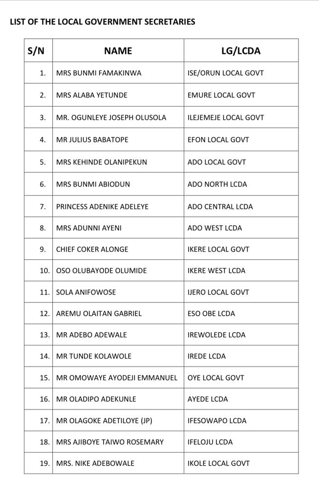 The Governor of Ekiti State, Mr Biodun Oyebanji, has approved the appointment of secretaries for the 16 local government councils and 22 local council development areas in the state.