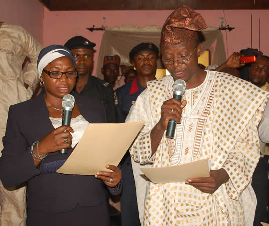 Newly elected Vice-Chairman, Offa Local Government Area of Kwara, Dr Yinka Olayonu (r), being administered oath of office and oath of allegiance by Magistrate, Kudirat Ambali in Offa on Sunday. PHOT: NAN