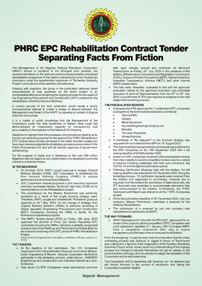 Dripping with prejudice, the group in the publication laboured albeit unsuccessfully to cast aspersion on the entire system in an unmistakable attempt at disrupting the ongoing process for the award of the Engineering Procurement and Construction (EPC) contract for the rehabilitation of the Port Harcourt Refinery.