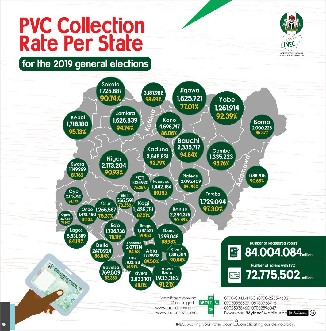The Independent National Electoral Commission (INEC) says 72,775,502 Permanent Voter Cards (PVCs), representing 86.63 per cent of the 84,004,084 registered voters nationwide were collected at the deadline for the collection of the cards.