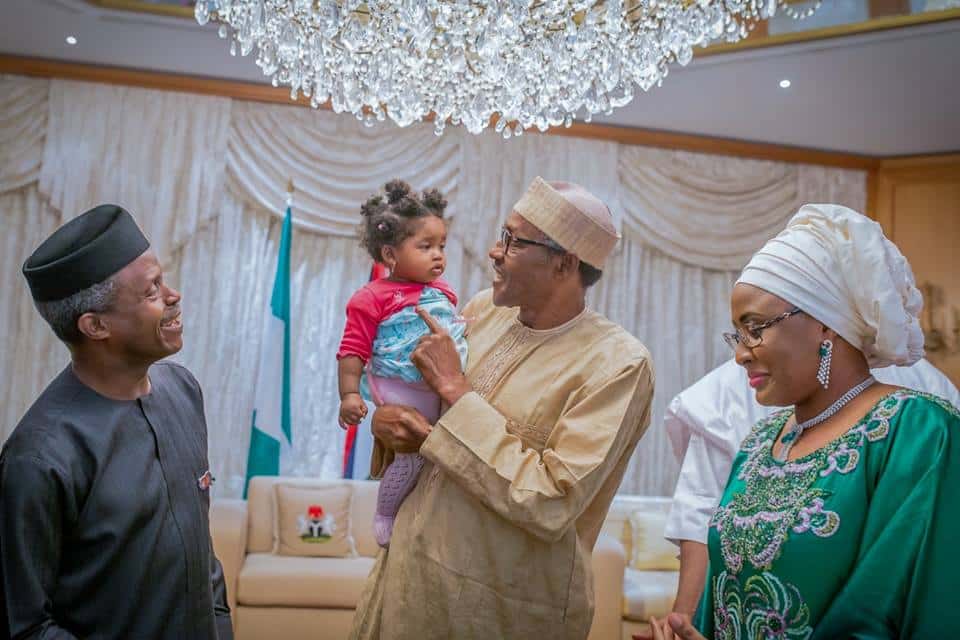 One of the pictures showed the president carrying a child standing alongside the Acting President, Prof. Yemi Osinbajo.