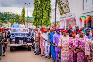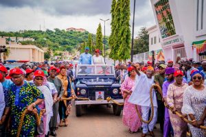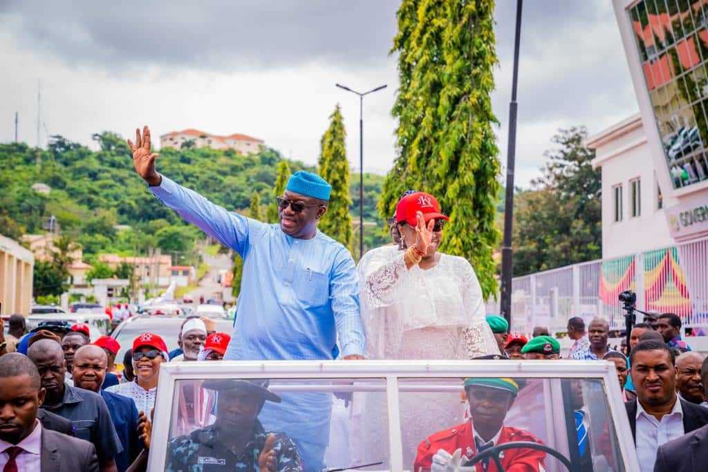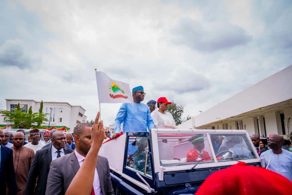 Fayemi, in a carnival like manner, was conveyed in a motorcade with his wife, Erelu Bisi Fayemi, and the deputy Governor, Otunba Bisi Egbeyemi, while members of the House of Assembly, executive council, political aides and Permanent Secretaries accompanied him with songs and jamboree from the front of Governor’s office to the entrance of the governor’s office main gate.