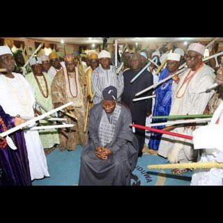 As the Ooni was praying for Jonathan, the over 70 monarchs present also started praying for him, pointing their staffs of office at him.