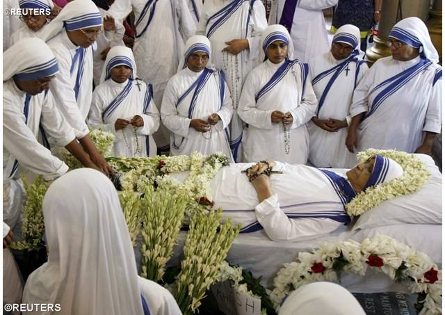 They gathered around Teresa’s tomb which was decorated with flowers, a single candle and a photo of the wrinkled saint.