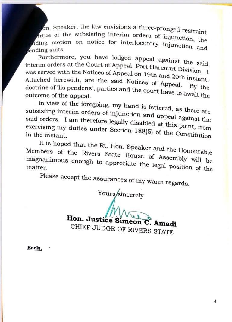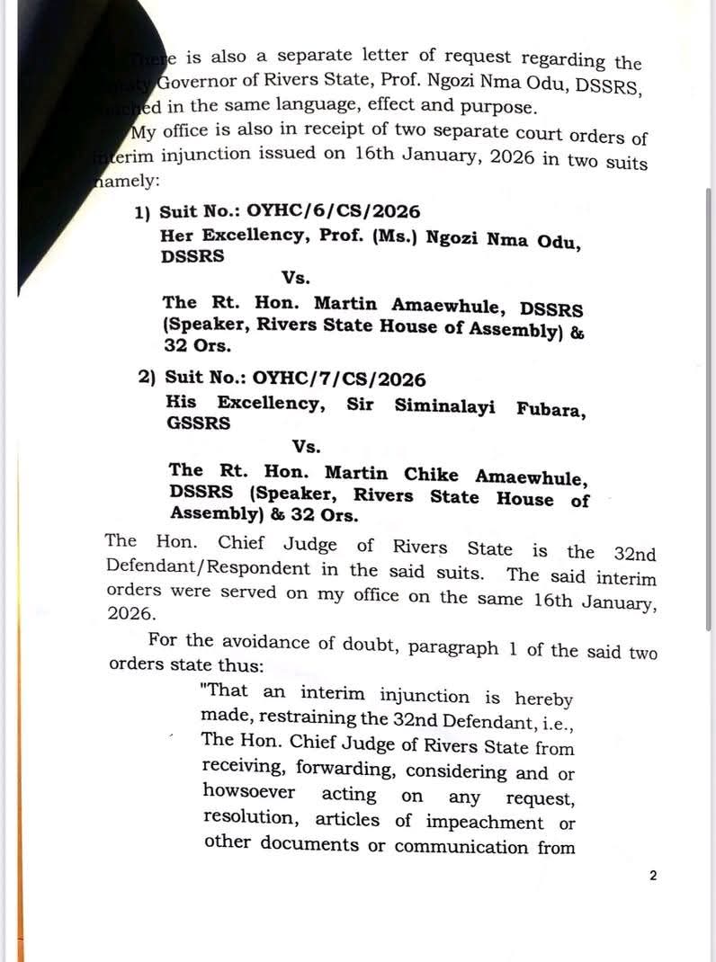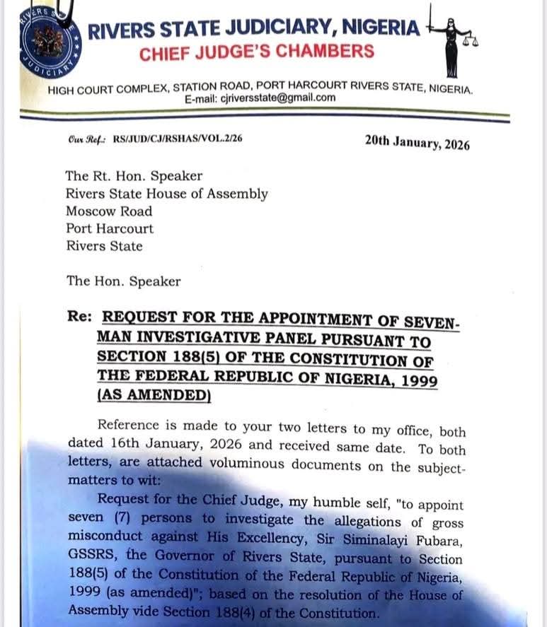 The Chief Judge of the oil-bearing state, Justice Chibuzor Simeon Amadi, has rejected a request from the lawmakers to establish a seven-member panel to probe allegations of gross misconduct against Fubara and his deputy.