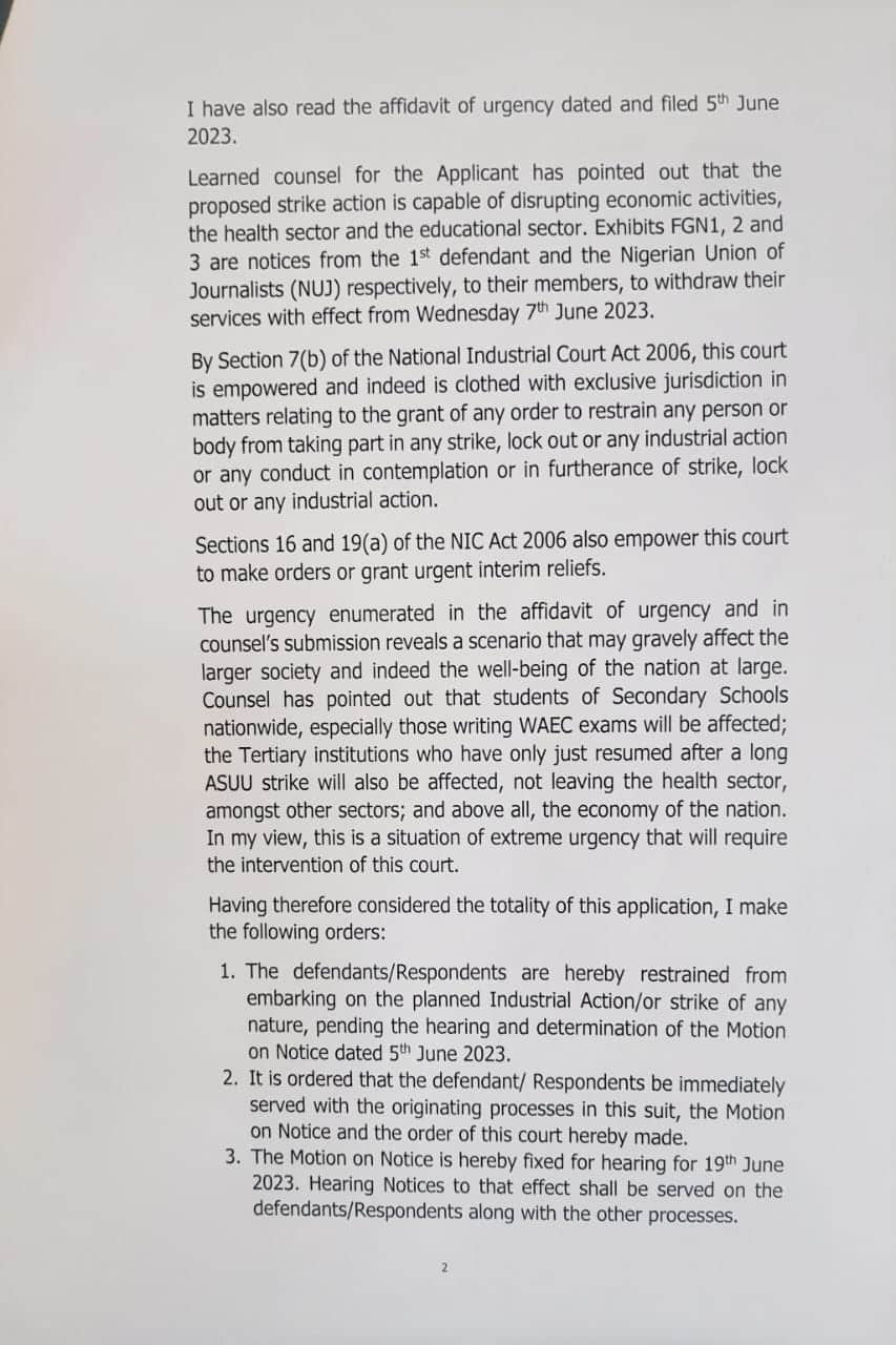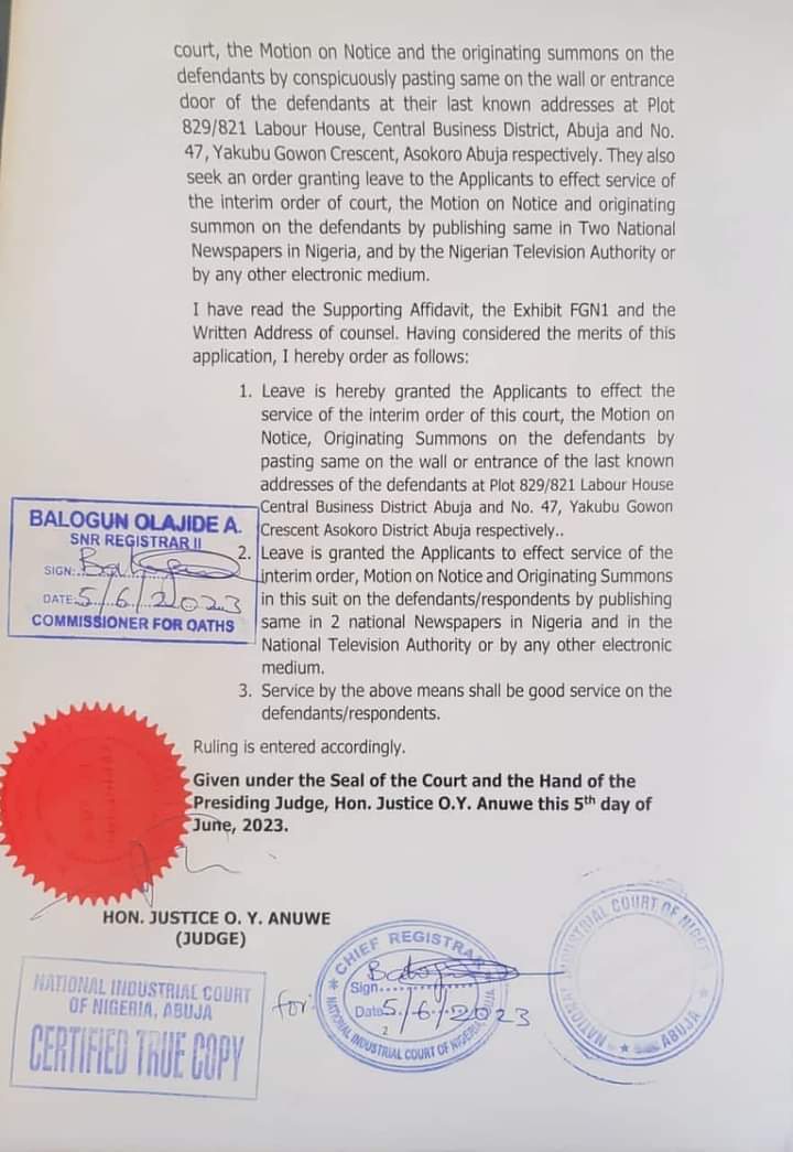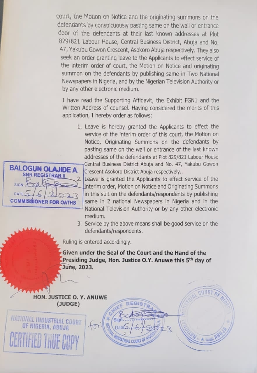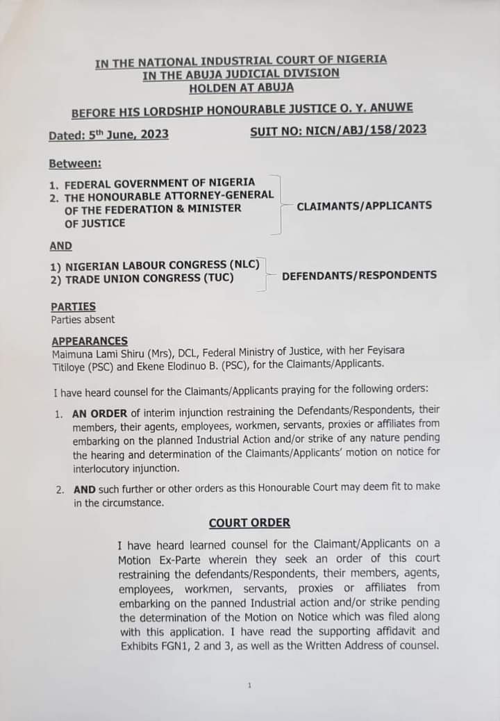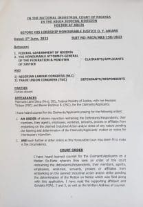 The order, given by Justice O.Y. Anuwe of the National Industrial Court (NIC), Abuja, was given, following the filing of a suit (NICN/ABJ/158/2023) by the Federal Government of Nigeria and the Attorney-General of the Federation against NLC and TUC.