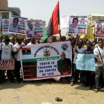 Some members of the Indigenous People of Biafra (IPoB) protesting the secret trial of their leader, Nnamdi Kanu, at the ...