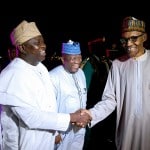 President Muhammadu Buhari greeting Governors Akinwunmi Ambode (Lagos) and Abubakar Yari (Zamfara) as he arrives New York, the United States ...