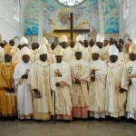 Olubunmi Cardinal Okogie (middle) with Catholic Bishops during his 80th birthday and Golden Jubilee of Priestly Ordination at the ...