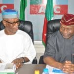 President Muhammadu Buhari (left) with the National Chairman of the All Progressives Congress (APC), Chief John Odigie-Oyegun, at the State ...