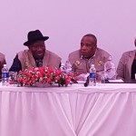 Leader of the African Union (AU) Elections Observer Mission in Zambia, former President Goodluck Jonathan (second left), with some ...