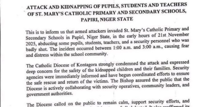 More than 50 pupils, students, teachers and workers of St. Mary’s Primary and Secondary Schools in Papiri Community, Agwara Local Government Area of Niger State have been abducted by terrorists.