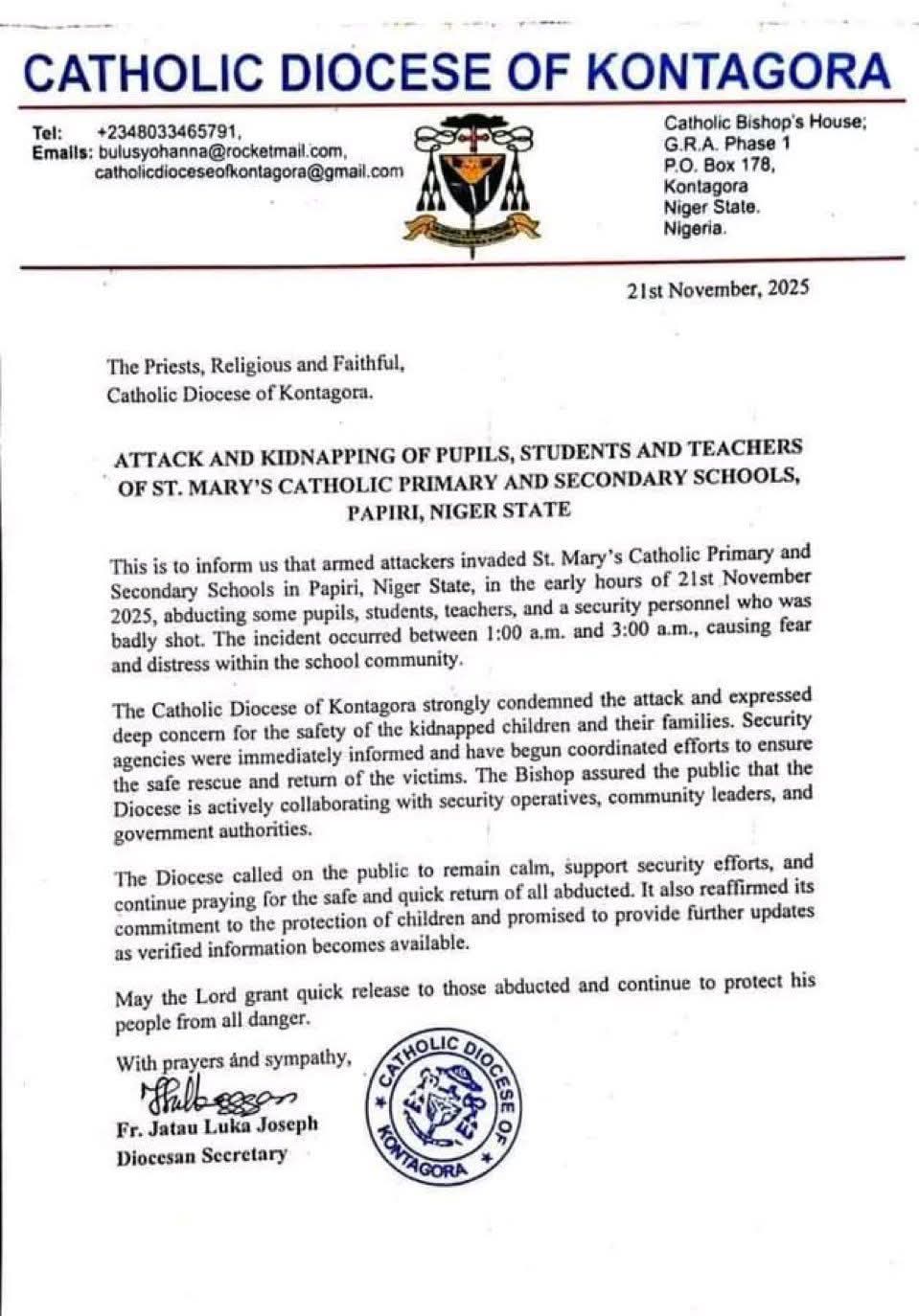 The Diocesan Secretary of Catholic Diocese of Kontagora, Father Jatau Luka Joseph, confirmed the incident in a statement.