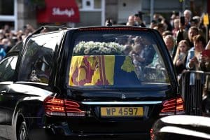 The Queen’s oak coffin, draped with the royal standard of Scotland with a wreath of Balmoral flowers on top, began its journey from the queen’s summer sanctuary in the Highlands and the first settlement it reached was Ballater.