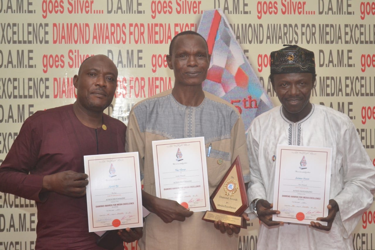 L-R: Second Runner-Up, The Hakeem Shitta Prize for Action Photography, Mr. Ayodele Ojo of The Sun; Overall Winner, Mr. Tony Eguaye of New Telegraph and First Runner-Up, Mr. Suleiman Husaini of New Telegraph, at the 25th Diamond Awards for Media Excellence (DAME) in Lagos…on Sunday.