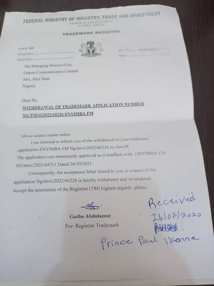 Also, Trademarks Registry, in another letter to EMPAU Communication Ltd titled: “Withdrawal of Trademark Application number NG/TM/O/2022/60226 ENYIMBA FM” reads: “I am directed to inform you of the withdrawal of your trademark application ENYIMBA FM NG/TM/O/2022/60226 in class 38.