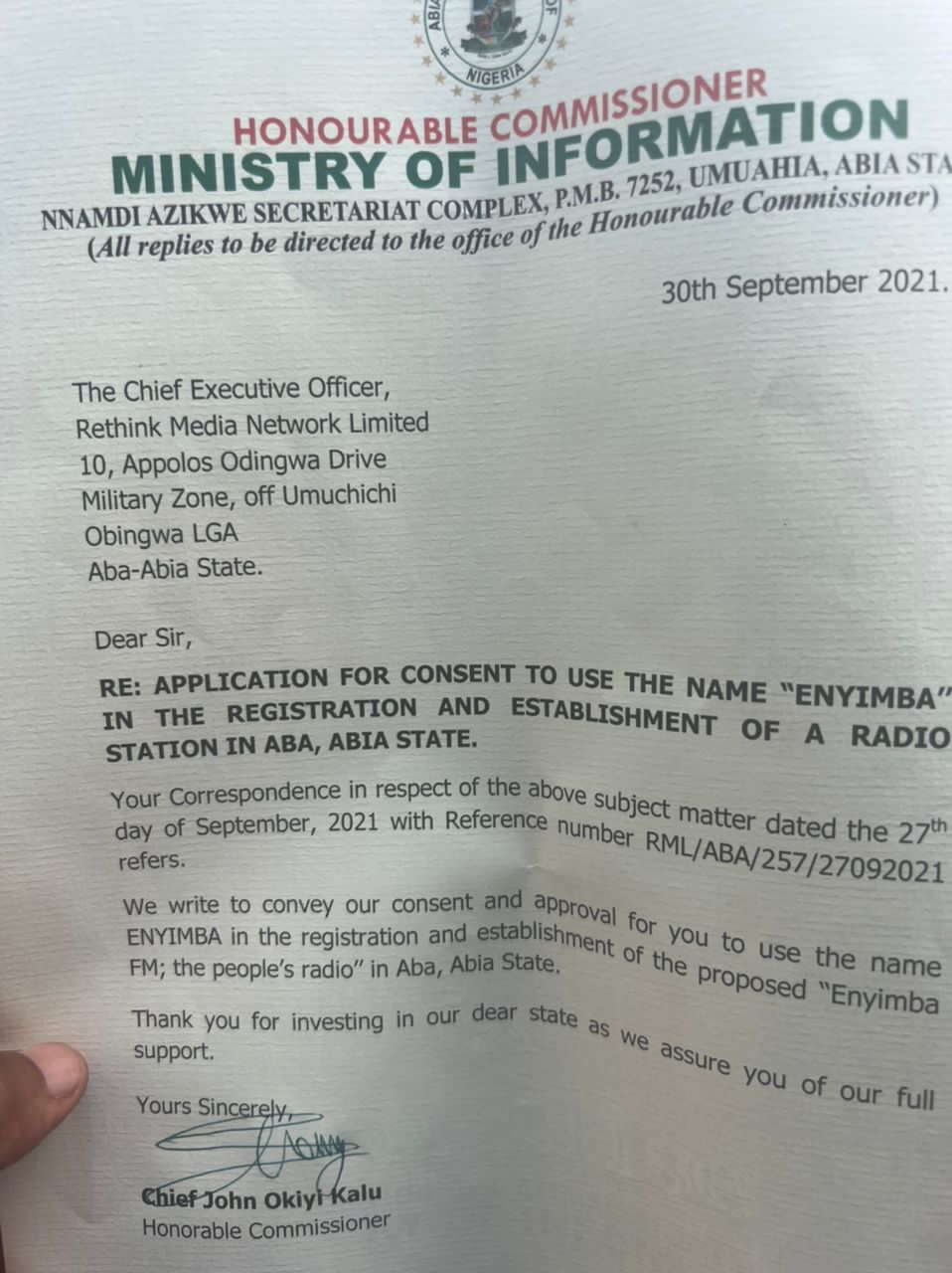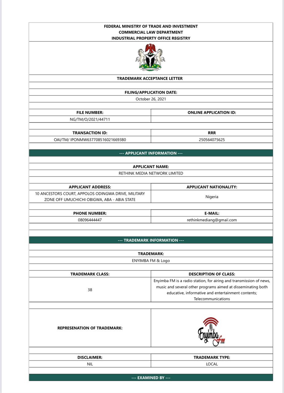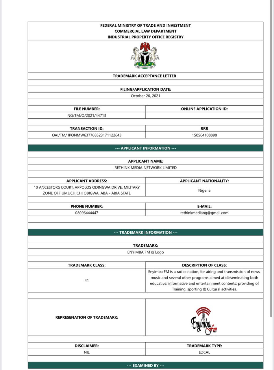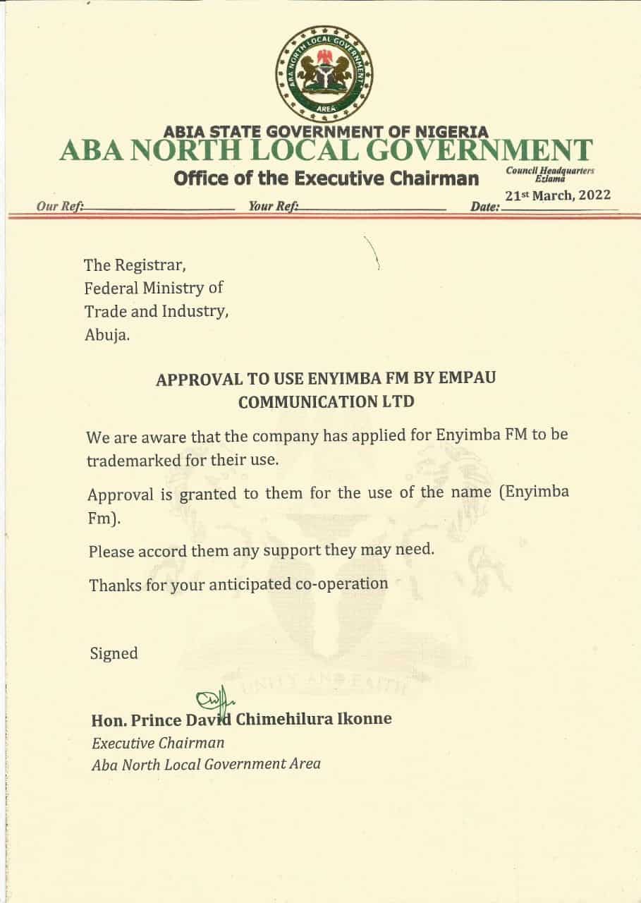 When contacted, Rethink Media Network Ltd Head Public Relations, Mr. Chigozie Joshua, recalled that after its application for a radio licence was approved by the NBC, the Company, on September 2021, approached the Abia State Government through the Ministry of Information, with an application for consent to use the name ENYIMBA FM for registration and establishment of a radio station in Aba as required by Trademarks Registry laws and guidelines, given that ENYIMBA is classified as a ‘Geographical Area’.