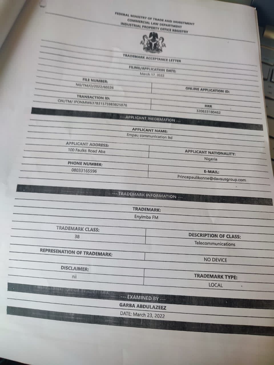 “The application was erroneously approved as it conflicts with ENYIMBA FM NG/TM/O/2021/44711 dated 26/10/2021.