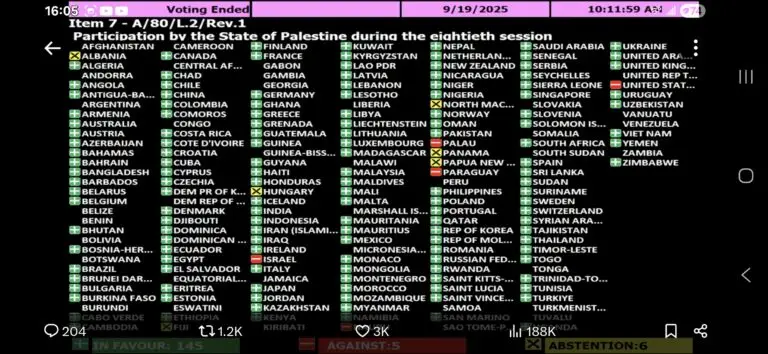 The resolution passed with 145 in favour, five against (Israel, Nauru, Palau, Paraguay, and the United States) and six abstentions (Albania, Fiji, Hungary, North Macedonia, Panama and Papua New Guinea).
