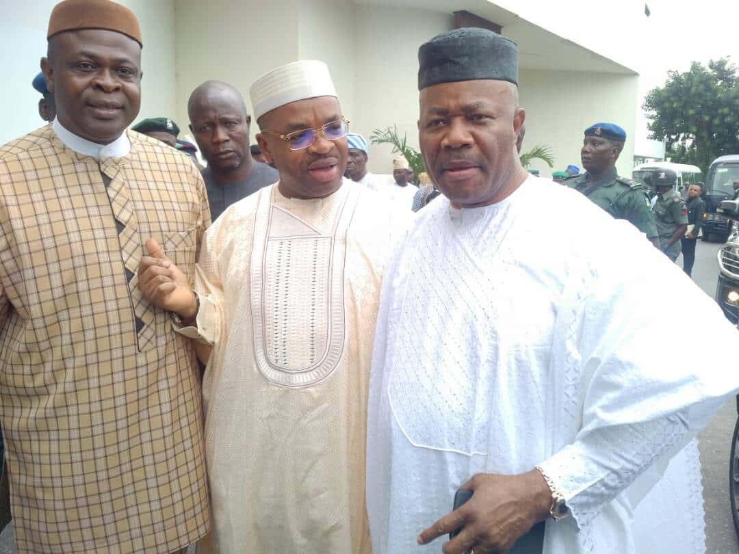 Governor Udom Emmanuel of Akwa Ibom State (centre); his predecessor and Senate Minority leader, Senator Godswill Akpabio (right) and former Akwa Ibom Commissioner for Local Government and Chieftaincy Affairs, Obong Uwem Ita Etuk, at the wedding of Oluwatosin, daughter of Senate President, Dr Bukola Saraki, to Adeniyi Olukoya, at the Ballroom, Eko Convention Centre, Lagos…on Saturday.