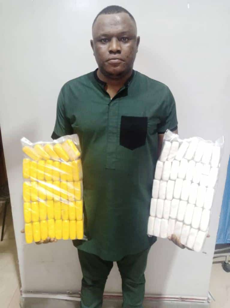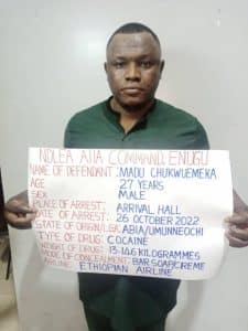 In the same vein, a 27-year-old Madu Chukwuemeka Miracle has been arrested by operatives at the Akanu Ibiam International Airport, AIIA, Enugu on arrival from Nairobi, Kenya via Addis Ababa, Ethiopia on Wednesday 26th Oct. A search of his three bags revealed seventy-six (76) foreign bathing soaps made with cocaine in one of the bags while another has two plastic bottles containing cream like liquid, which tested positive to cocaine. The cocaine bars weigh 10.650 kilograms while the liquid cocaine weighs 2.496 kilograms, bringing the total weight to 13.146 kilograms.