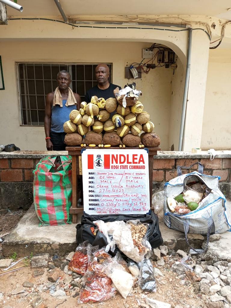 In Kogi state, NDLEA operatives on stop and search operation along Okene-Abuja highway on Thursday 27th Oct intercepted a Chisco branded bus coming from Lagos to Abuja with a consignment of 32.9kgs Meth packaged as tubers of yam; 376 grams of cocaine and 215 grams of heroin.