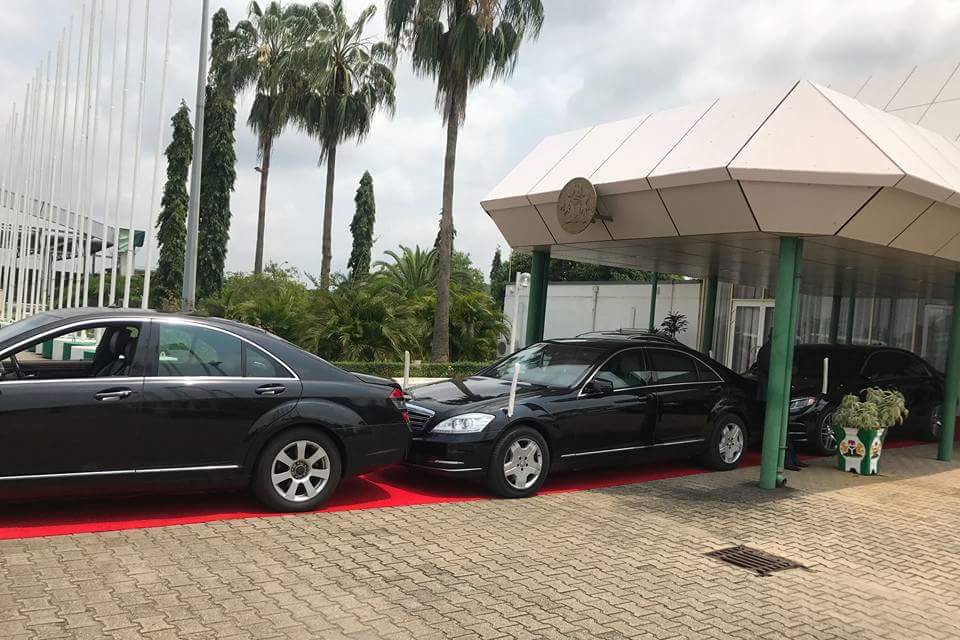 Some of the official vehicles waiting at the Presidential Wing of the Nnamdi Azikiwe International Airport, Abuja for the arrival of President Muhammadu Buhari from London…on Saturday.