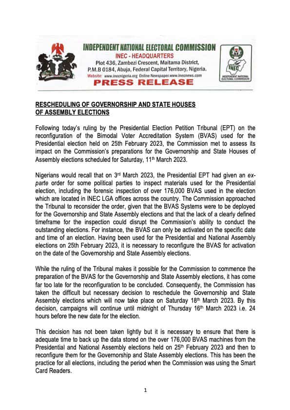 The Independent National Electoral Commission (INEC) has rescheduled Governorship and State House of Assembly elections earlier fixed for March 11 to March 18.