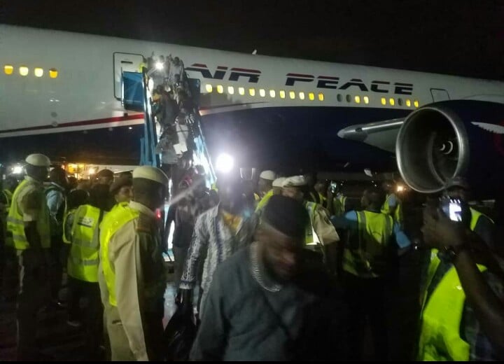 The joyous returnees arrived at the Cargo Wing of the Murtala Muhammed International Airport, Lagos about 7.21p.m aboard an Air Peace B777 aircraft with registration number 5N-BWI.